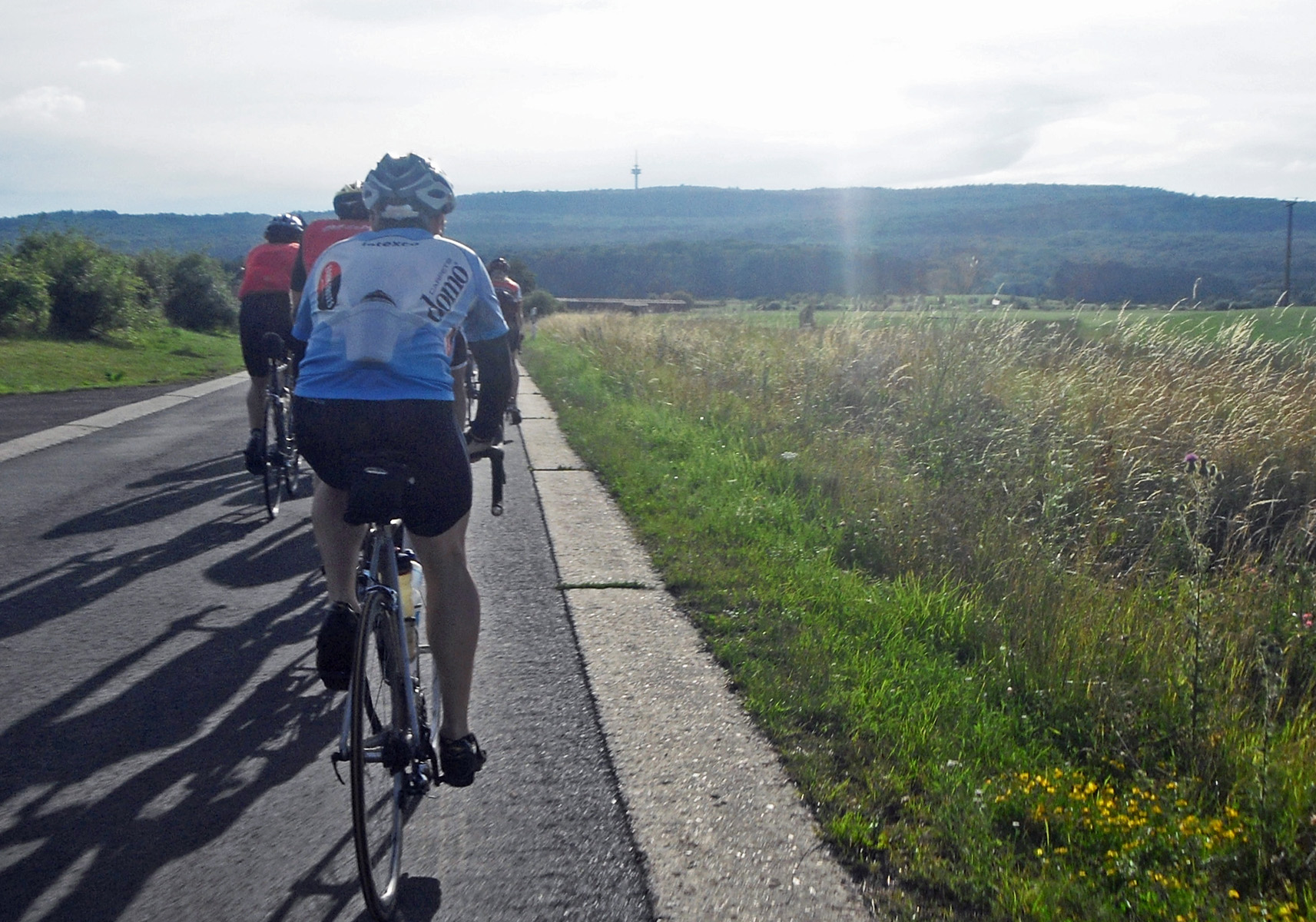 Bei trockenen Straßenverhältnissen trauen sich mit der Zeit immer mehr Teilnehmer, den Windschatten des Vordermanns oder der Vorderfrau auszunutzen. So wird Kraft schonend, überwiegend auf Wirtschaftswegen entlang gelber Rapsfelder und frisch grüner Wiesen dahin gerauscht. Die Körner verbrauchen sich aber noch beim Anstieg der Panzerstraße von Ockstadt in das Nordostende des Taunus. Kurz später, können sich die geplagten Waden im Café bei Kaffee und Kuchen bei Bad Nauheim wieder erholen. Der herrlich klare Blick in die Ebene stärkt zusätzlich noch Geist und Seele. Eine rasante Abfahrt führt in die Innenstadt von Bad Nauheim. Dort geht es mit fahrerischem Geschick durch Unterführungen und wieder über Wetterauer Nebenwege zurück in die Metropole. Gut gelaunt erreichen die sportlichen FahrerInnen nach ca. 84km und 700hm den "Adler" zur Schlusseinkehr.