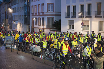 Ganz ohne Konflikte mit Fußgängern und Autofahrern bewegte sich der lange Zug auf der abgesperrten Autobahn an der Messe vorbei zurück zum Römer. Dass alles so entspannt und bis auf ein paar Ausrutscher auf nasser Straße auch ohne Blessuren ablief, ist den 100 ADFC-Ordnern aus Frankfurt und ganz Rhein-Main zu danken, die gleich hinter der Polizei die Querstraßen absperrten. Zur Belohnung konnten sie bis zu fünf Mal den ganzen leuchtenden Zug ansehen und wieder überholen zum nächsten Einsatz an der Spitze.