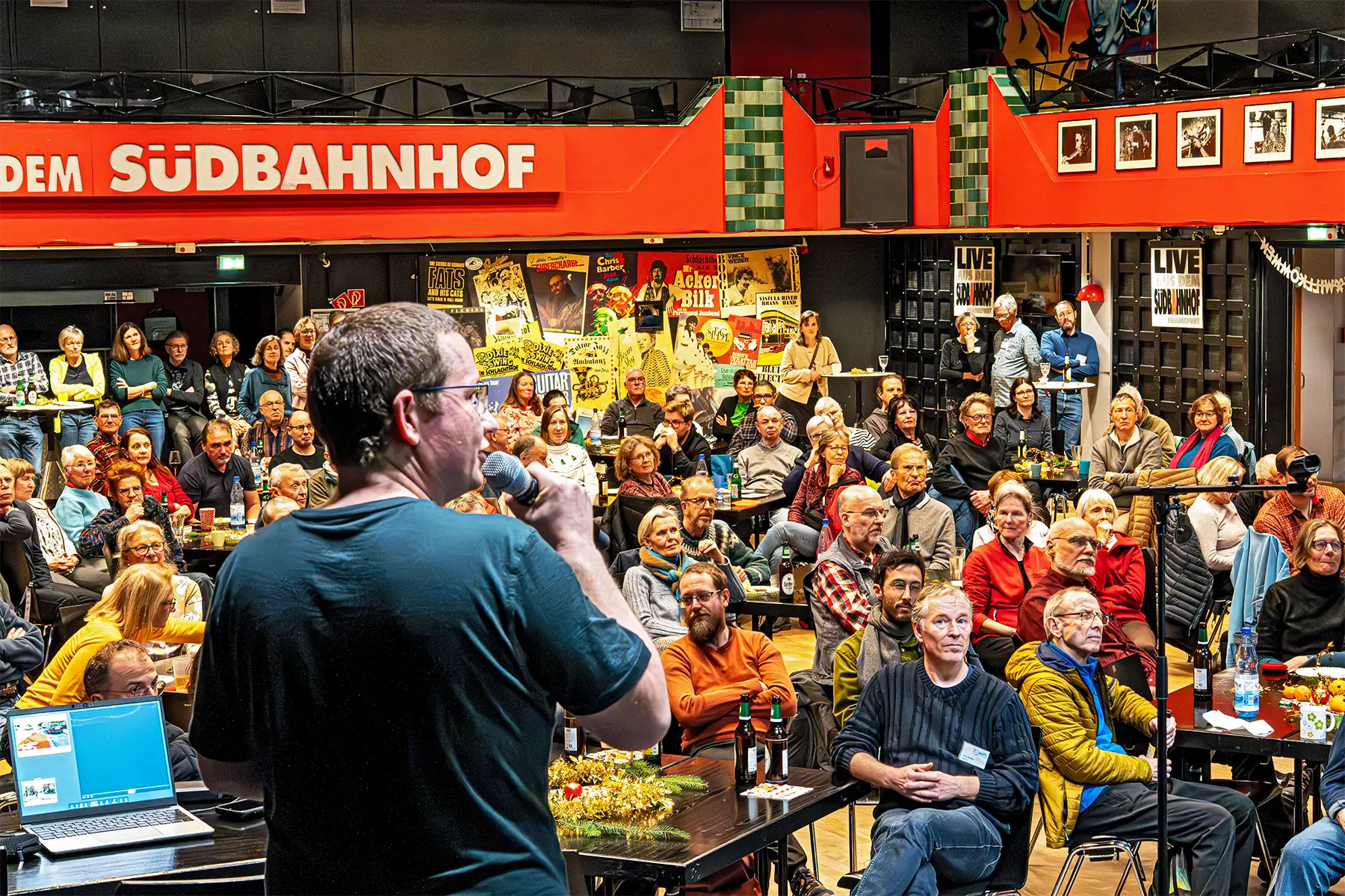 Beim „Verkehrspolitischen Jahresrückblick 2025“ zeigte Ansgar Hegerfeld als Verkehrspolitischer Sprecher, welche Themen ihn und die Verkehrs-AG besonders beschäftigt hatten. Geradezu begeistert zeigte er sich über (wenn auch nur vorübergehend) komplett autofreie oder durch Baustellen gesperrte Straßen, was klaglos von Autofahrenden akzeptiert wird, während ein Radweg an gleicher Stelle zu aufgeregten Debatten führt. Da darf zum Ende des Vortrags die Erinnerung an die Kommunalwahl am 15. März des nächsten Jahres nicht fehlen. „Geht wählen!“ fordert Ansgar auf, denn jede Stimme für eine dem Fahrrad gewogene Partei wird wichtig sein.