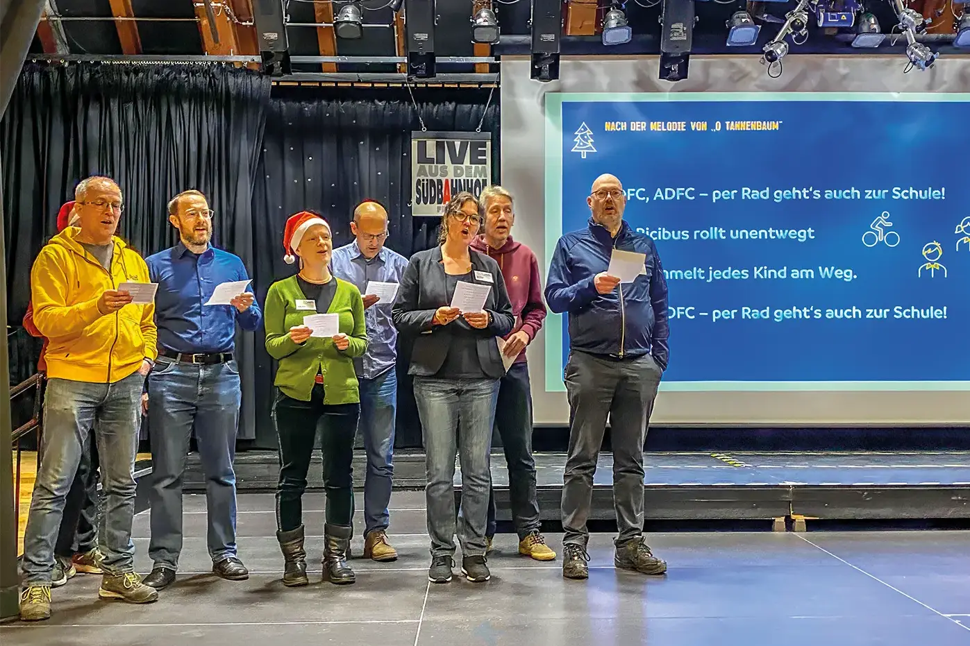 In der Einladung stand „The same procedure as every year? Ganz genau!“. Doch das traf auf die diesjährige Weihnachtsfeier nur zum Teil zu. Denn gleich zu Beginn des Abends wurde im Albert-Mangelsdorff-Saal im Saalbau Südbahnhof eine Weltpremiere präsentiert: Der Vorstand des ADFC Frankfurt am Main singt! Und fordert das Publikum auf, mitzusingen. Das ziert sich etwas, belohnt den Chor aber begeistert mit enormem Applaus, fordert gar Zugaben. Doch darauf werden wir leider ein weiteres Jahr warten müssen.