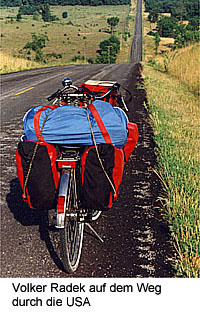 Um die Ausstellungsstellwände bildeten sich oft kleine Trauben von Interessierten, schnell kam es zu Gesprächen über die einzelnen Fotos und die dargestellten Reisemomente. Erinnerungen an eigene etwaige Ein- und Ausblicke wurden wach, es wurde über ähnliche Landschaften oder stimmungsvolle Momente auf einer Radtour geredet. So wurde die Ausstellung für viele Messebesucher ein kleiner Aperitif vor den Informationen und Angeboten für die neue Saison in der großen Halle. Ein Foto von Lars Langefeld, aufgenommen während einer Winterfahrt auf Bornholm, war in kurzer Zeit, im Stimmungsbild des Publikums, der Renner. Gefolgt von einer Baumallee in Mecklenburg-Vorpommern, fotografisch festgehalten von Ulrike Libuda. Viele Besucher sprach ein weiters Foto von Lars Langefeld an, das einen stimmungsvollen Sonnenuntergang auf Hiiumaa in Estland zeigt. In der Gunst der Betrachter kam Volker Radek mit seinem Foto auf Platz 4. Das Bild fängt einen Augenblick auf seinem Weg mit dem Rad quer durch die Vereinigten Staaten von Amerika ein. Mit einem Dankeschön-Geschenk, einem Buch „Mit Schlauch und Pedal“ hat sich der ADFC Frankfurt bei L. Langefeld, U. Libuda und V. Radek für die Teilnahme an der Fotoausstellung bedankt. Den TeilnehmerInnen an der Fotoausstellung sei gesagt, die BesucherInnen des Radreisemarktes hatten ihre große Freude an allen gezeigten Fotos. Danke an alle FotografInnen und vielleicht fotografieren Sie ja in dieser Saison 2003 unter dem Blickwinkel für ein Ausstellungsfoto. Und wer weiß, auf dem 8. RadReiseMarkt des ADFC Frankfurt im Jahr 2004 erfreuen Sie sich und ein interessiertes Publikum an ihrem persönlichen Radreisefoto – die Veranstalter würde es freuen. Lothar Hennemuth