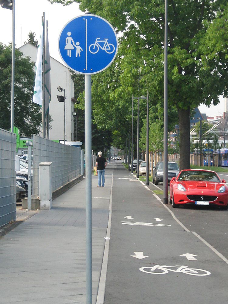 Allerdings ist nun entlang der östlichen Seite der Friedberger Landstraße die Befahrung des ,linken' Radwegs stadteinwärts gestattet. In Höhe der Einmündung Gießener Straße steht ein Schild, das die Befahrung gestattet. Weiterhin weisen Pfeile auf der Fahrbahn auf das Befahren in beide Richtungen hin. Im weiteren Verlauf des Radwegs ist keine Aufhebung dieser Benutzungspflicht zu erkennen, so dass Radfahrer früher oder später an der Einmündung Münzenberger Straße landen, wenn sie nicht vorher in die bekannten Fallen von Tankstellen- oder sonstigen Ausfahrten geraten sind.