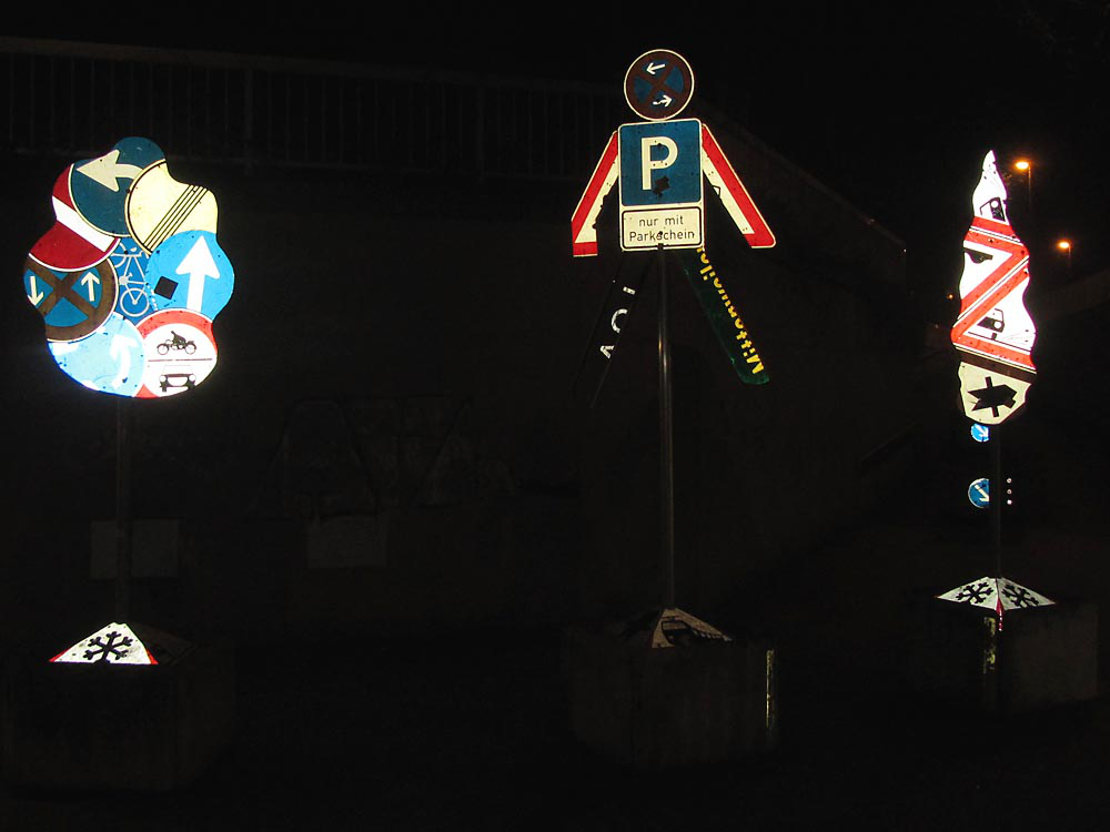 Christian Martens aus Bad Vilbel, als Bahntrassenradler den meisten Lesern bekannt (siehe Seite 17), entdeckt auch auf anderen (Rad-) Wegen Reiz- und Kunstvolles. In Biberach an der Riß fand er diese Ansammlung von gebrauchten Verkehrsschildern. Schon bei Tageslicht ein Hingucker, gewinnen sie bei Dunkelheit im Lichte eines Scheinwerfers noch an Bedeutung.
