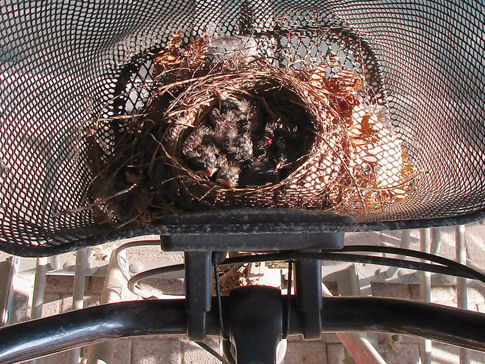 Bockenheim Auf dem Messegelände wird Rad gefahren, über 130 Diensträder helfen den Mitarbeitern, auf dem weitläufigen Areal von Halle zu Halle zu gelangen. Manches Rad jedoch parkt wettergeschützt über Wochen und Monate an einem Platz. Nun hat sich ein Vogel den Korb vor dem Lenker eines dieser Langzeitparker zu seiner Heimstatt erkoren und dort ein Nest gebaut. Irgendwann lagen darin ein paar Eier, aus diesen schlüpften nun junge Vögel. Hoffen wir, dass der Mitarbeiter sein Rad nicht so bald bewegen will.
