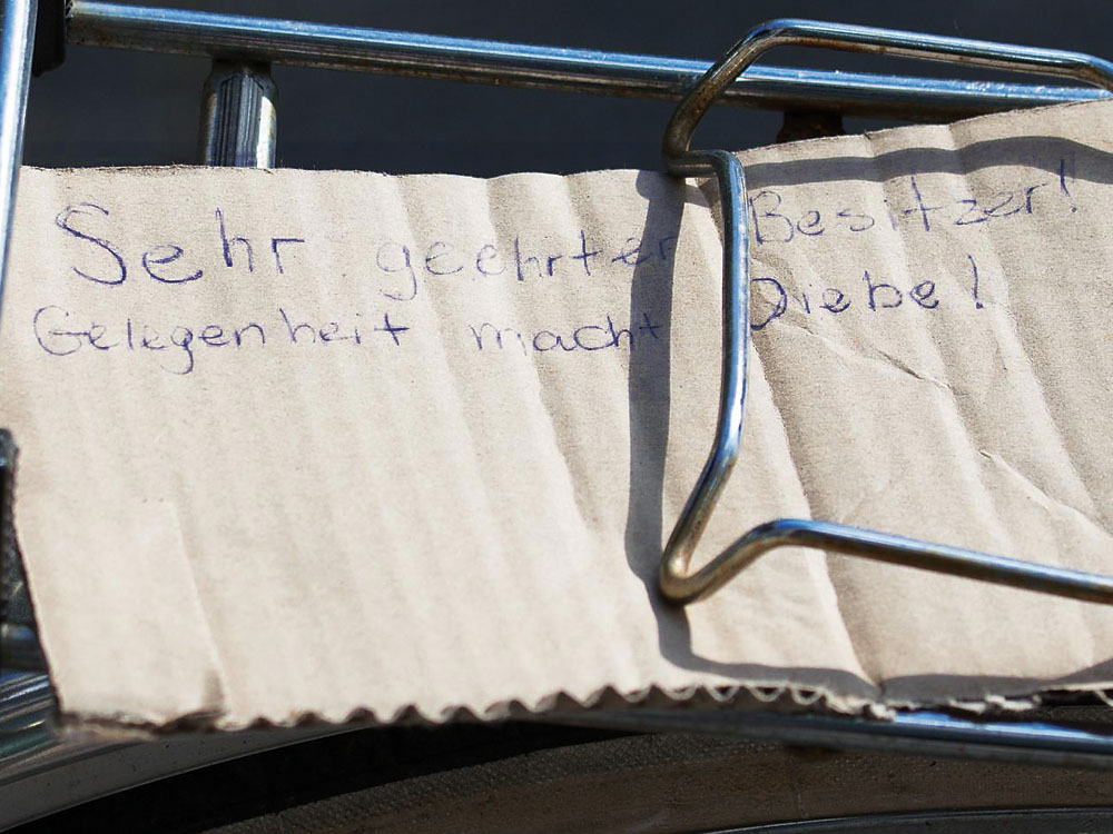 Bockenheim Ein älteres Herrenrad, leicht ramponiert aber fahrtüchtig, steht unabgeschlossen am Wegesrand. Das fiel einer vorüber gehenden Passantin auf. Doch statt nun die Gelegenheit zu nutzen und zur Diebin zu werden, zückte sie Pappkarton und Kugelschreiber und hinterließ eine Nachricht. Vorbildlich!