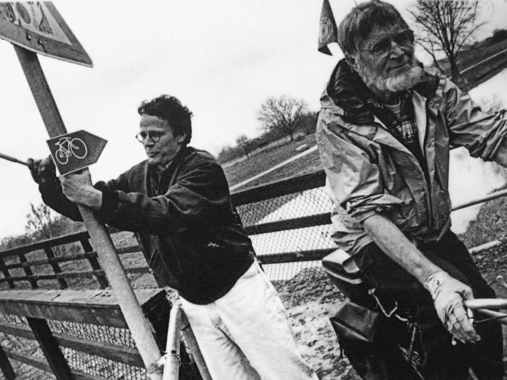 "Schon im März 1991 – die Stadtverordnetenversammlung hat den GrünGürtel noch gar nicht beschlossen – montiert der zuständige Umweltdezernent Tom Koenigs die ersten Schilder für den geplanten Radrundweg: bis heute ein Herzstück des GrünGürtels."