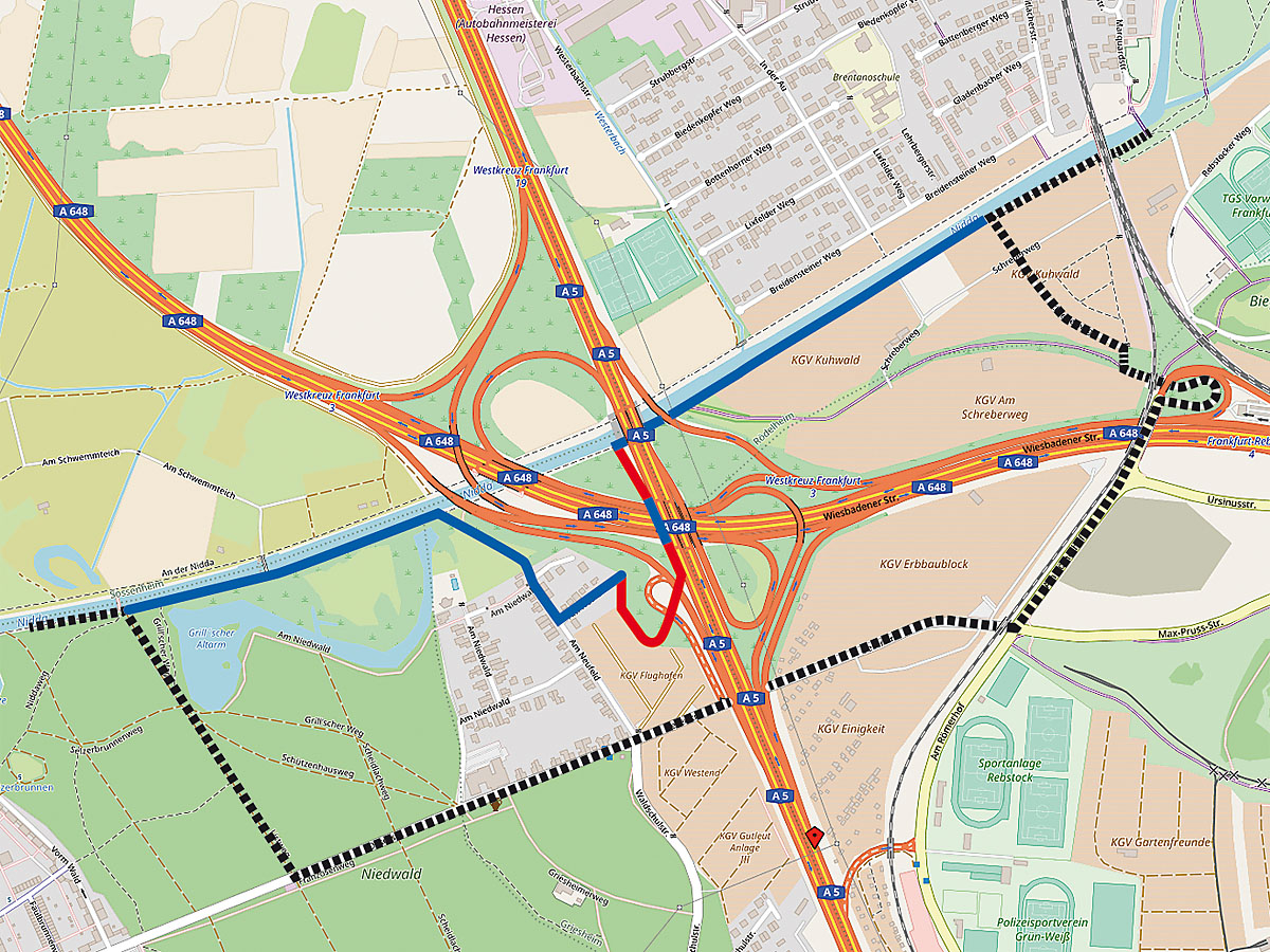 Das wäre dann schon nicht mehr eine provisorische Lösung, sondern es entstünden, zusätzlich zu den Niddauferwegen Nord und Süd, zwei Ingenieurbauwerke mit dauerhaftem Bestand. Von Nied aus betrachtet, würde der Rad- und Fußverkehr am letzten Wehr über die Nidda ans nördliche Ufer geführt, auf existierenden Wegen (die noch zu ertüchtigen wären) an die A 648 heran, unterquert dann diese und kurz danach die zwei Verbindungsspuren im Nordwest-Kleeblatt des Autobahnkreuzes, um dann wieder zum Niddaufer zurückzuführen.