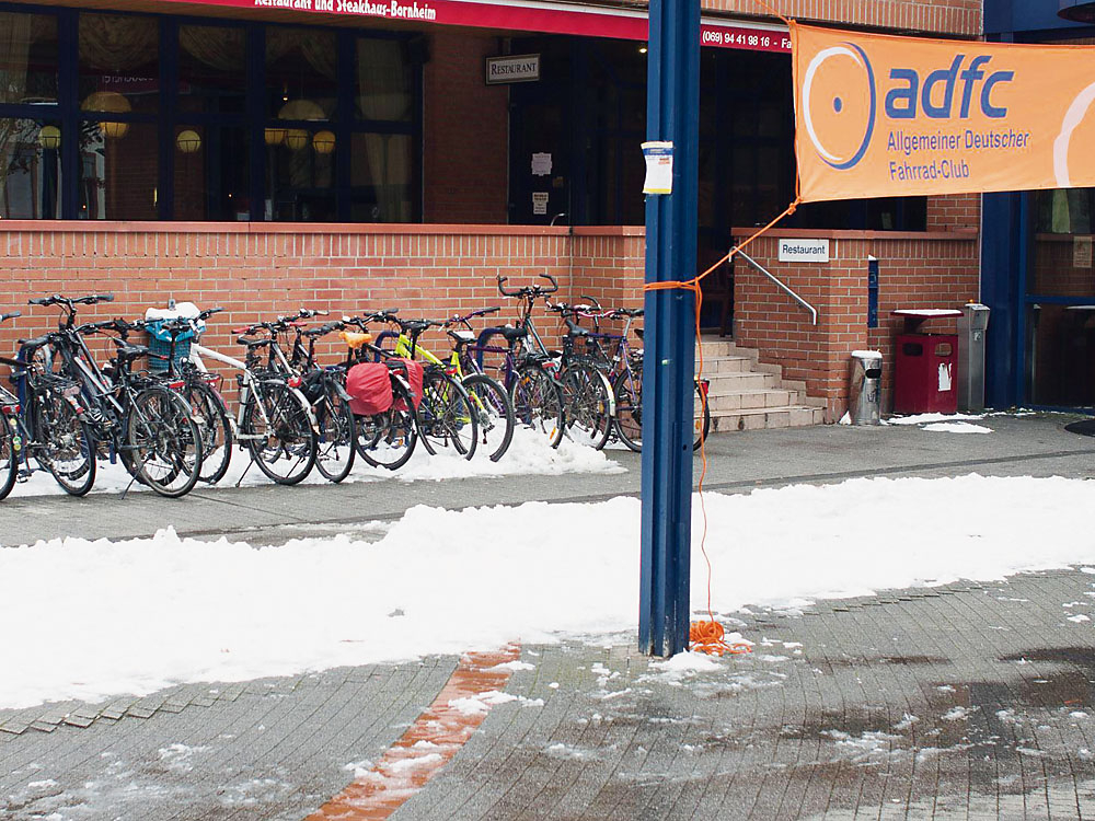 Diese Überraschung hatte es in den Jahren davor zur RadReiseMesse noch nicht gegeben: Ausgerechnet am Veranstaltungstag, am 18. März, lag Frankfurt unter einer frischen, dichten, weißen Schneedecke.