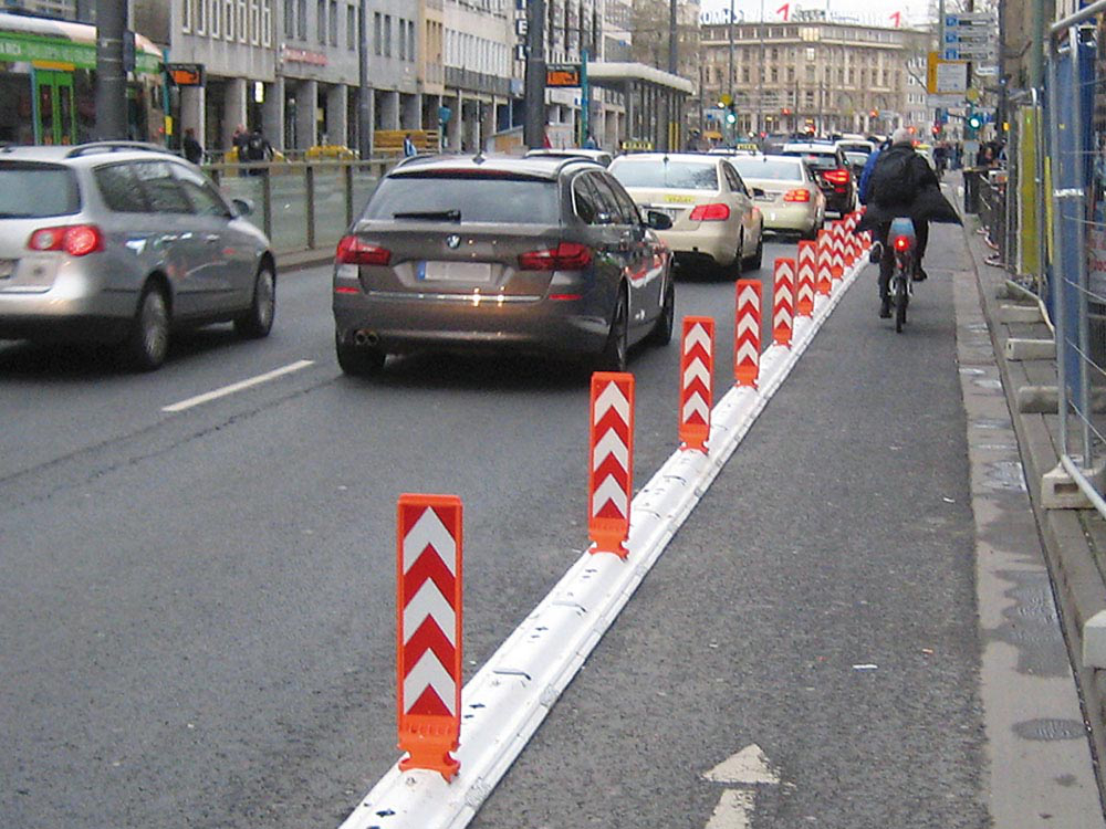 Endlich! In der Düsseldorfer Straße wurde der Radstreifen mit Klemmfixen geschützt. Doch in eine Lücke für die Bushaltestelle zwängen sich prompt schon die Falschparker. Hier soll aber bald Abhilfe geschaffen werden. Übrigens: so etwas ist keine "protected bike lane", sondern nur eine Defensivmaßnahme auf kurzer Strecke gegen das Zuparken von Rad- und Schutzstreifen.