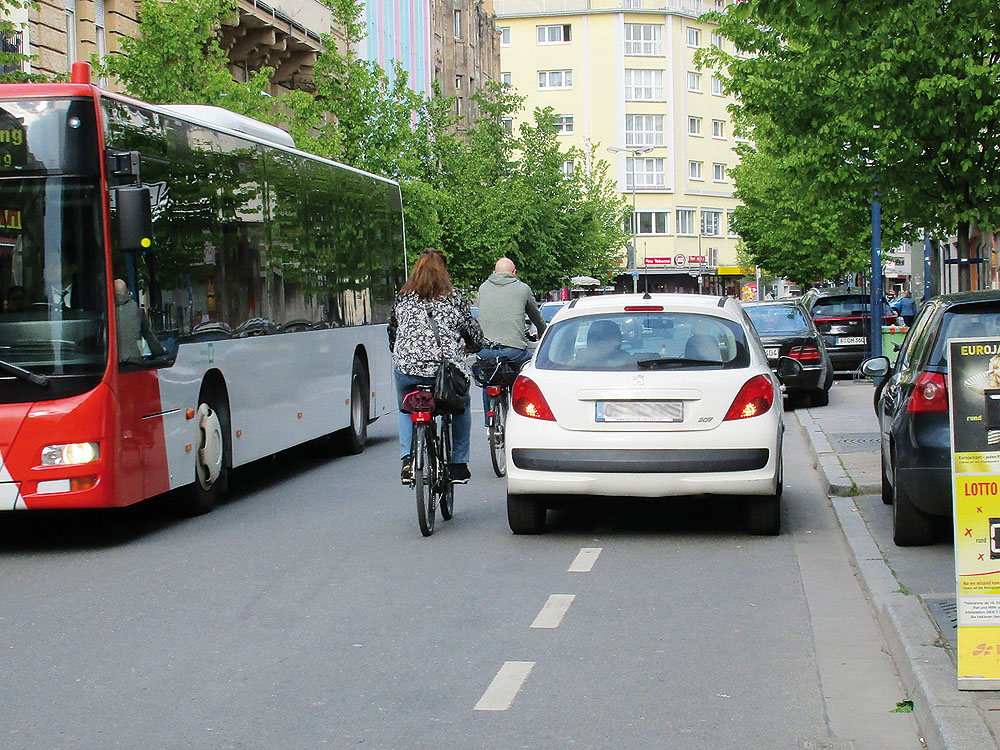 Mangelnde Polizeikontrollen verärgern die Offenbacher Radfahrenden (hier Radstreifen in der Frankfurter Straße)