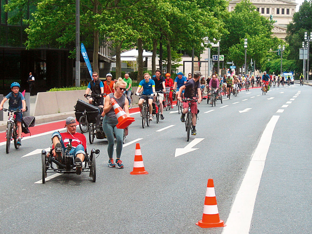 Es gab mittlerweile drei Aktionen von ADFC und Radentscheid, um das Thema zu pushen – Ende April auf der Untermainbrücke, Ende Mai im Rahmen einer bundesweiten Bündnisaktion am Messeturm und zuletzt Ende Juni, als "rollender Popup-Radweg", am kompletten Anlagenring und Cityring.