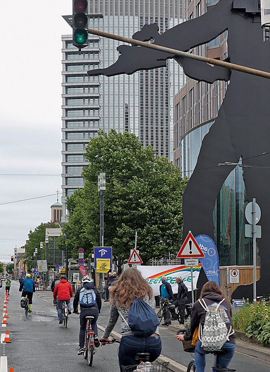 Zweieinhalb Stunden brauchten am 28. Juni die Aktiven von ADFC und Radentscheid, um an Anlagenring und Cityring, also zweimal rund um die City, eine symbolische Bikelane aufzustellen. Reale Popup-Bikelanes brauchen schon etwas länger, aber diese wäre in wenigen Tagen auf die Straße gebracht.
