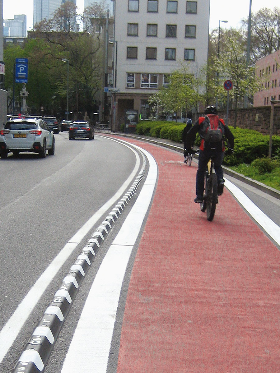 An einigen anderen Stellen in Frankfurt, wo das Falschparken tagsüber ein Problem ist, gibt es bereits Separationstechnik, meistens in Gestalt des "Klemmfix"-Systems. Das sind auf einen weißen Kunststoffschweller aufgeschraubte, etwa meterhohe Plastikbaken in Orange, die im Notfall von Rettungsfahrzeugen überfahren werden können. Die Klemmfixe erfüllen ihren Zweck der Falschparkervergrämung recht effektiv, aber stilisisch sind sie zweifellos suboptimal, bei Stadtplanern daher nicht gerade beliebt.