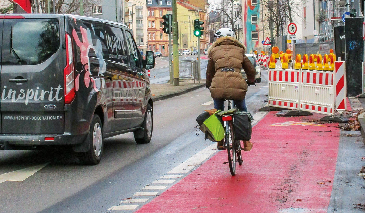 Da wurden 2019 unter großem öffentlichem Trara die „roten Teppiche“ markiert, die Radstreifen auf der Friedberger Landstraße, die bei der Fahrrad-Community auf Begeisterung stießen – und zwei Jahre später ist der Spaß schon wieder vorbei. Zwei Bauherren möchten an der Friedberger, stadtauswärts zwischen Mauerweg und Gaußstraße, je ein größeres Wohnhaus bauen und richten die Baustelle so ein, dass sie nur über die Friedberger Landstraße ver- und entsorgt werden kann. Und weg ist der Radstreifen, auf hundert Metern, und das für mehrere Jahre! Der Ärger ist groß, der Shitstorm schlägt beim ADFC und auch beim Radfahrbüro massiv auf – nur ändern tut sich nichts!
