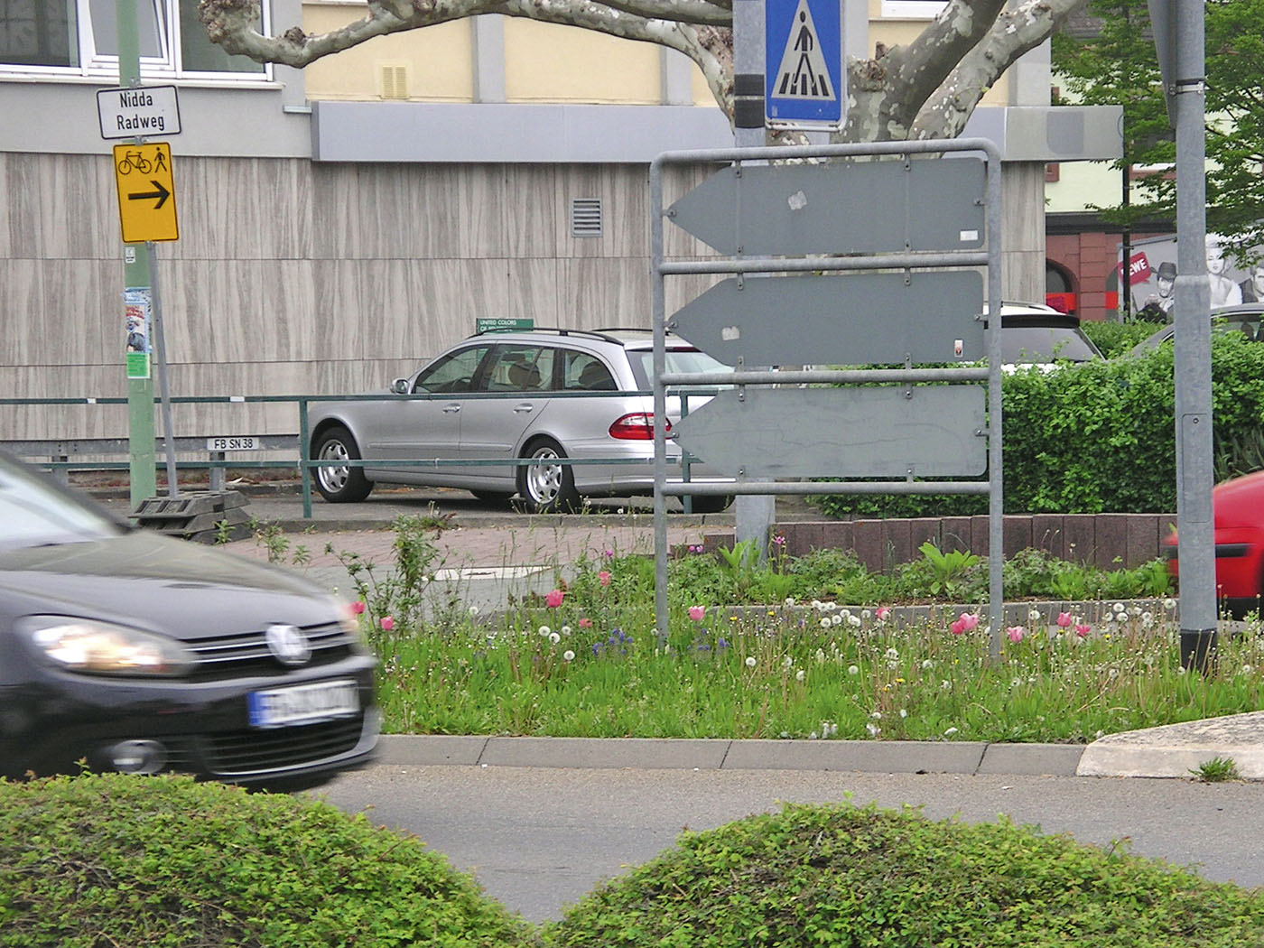 Aufgrund von Baumaßnahmen in der Frankfurter Straße kam es bereits in der jüngeren Vergangenheit zu Einschränkungen und Verkehrsstaus in dieser Straße – eine Situation, die sich so wieder einstellen wird, denn die Baumaßnahmen sind kürzlich in die nächste Etappe gegangen und werden noch eine ganze Weile andauern. Ein Gefühl der Sicherheit für Radfahrende und auch für den Fußverkehr will sich im Umfeld des Kreisverkehrs nicht einstellen; Radfahrende benutzen immer wieder verkehrswidrig den Gehweg oder den in südlicher Richtung verlaufenden benutzungspflichtigen Radweg ab der Einmündung der Wiesengasse in die Frankfurter Straße. Durch die falschen Umleitungsschilder wird dieses Verhalten noch bestärkt.