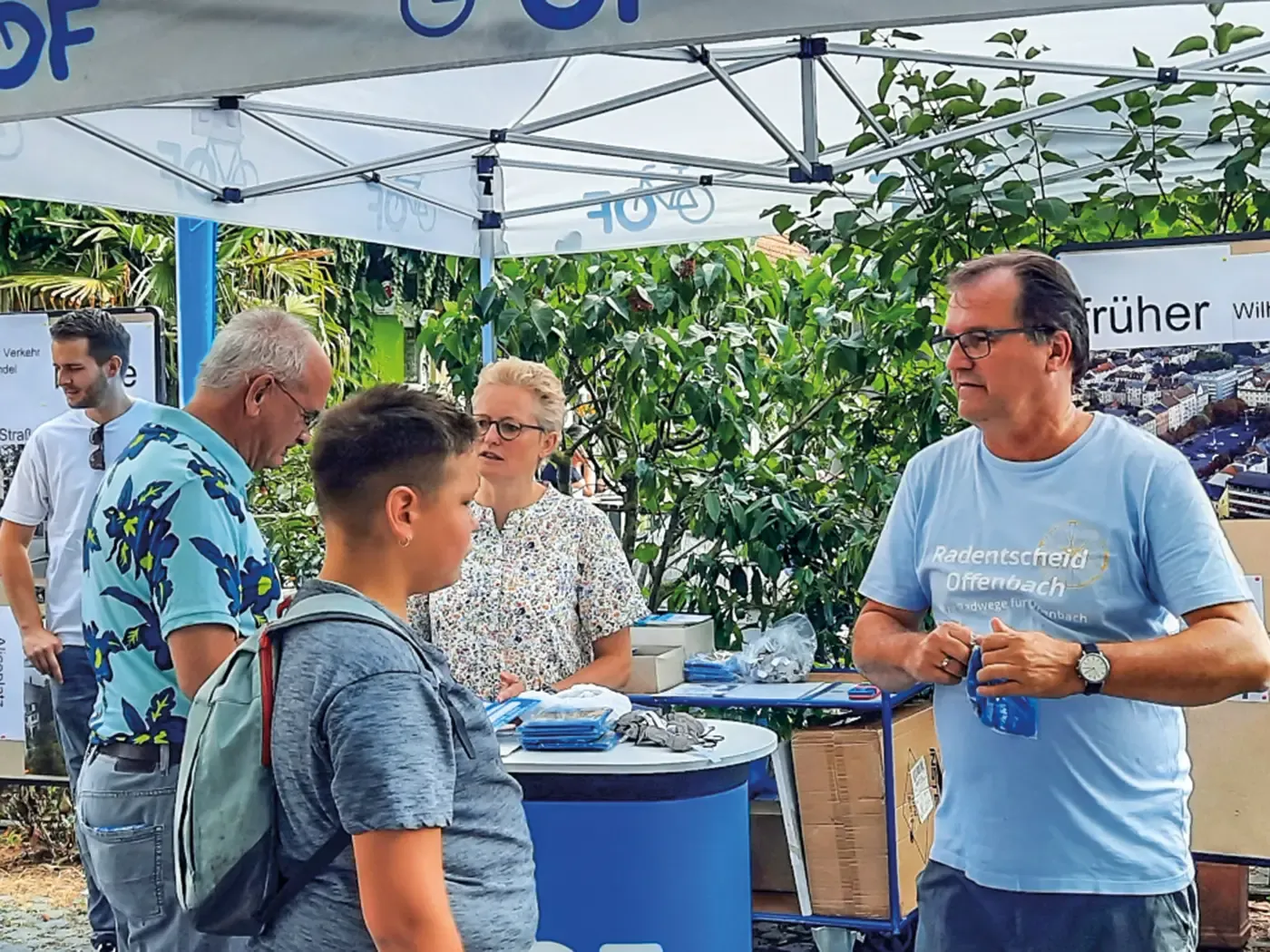 rechts: Bürgermeisterin Sabine Groß und Radentscheid-Sprecher Jochen Teichmann (rechts) im Gespräch mit Offenbacher:innen