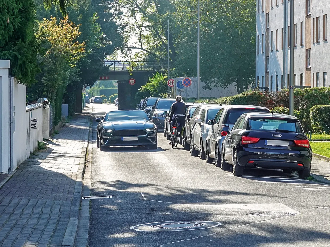 Das Fahrzeug im Bild hätte ca. drei Fahrzeuge weiter hinten halten müssen, um der Radlerin die Ausweichmöglichkeit in einen freien Parkplatz zu ermöglichen. So beträgt der Seitenabstand weniger als die erforderlichen 1,5 Meter innerorts.