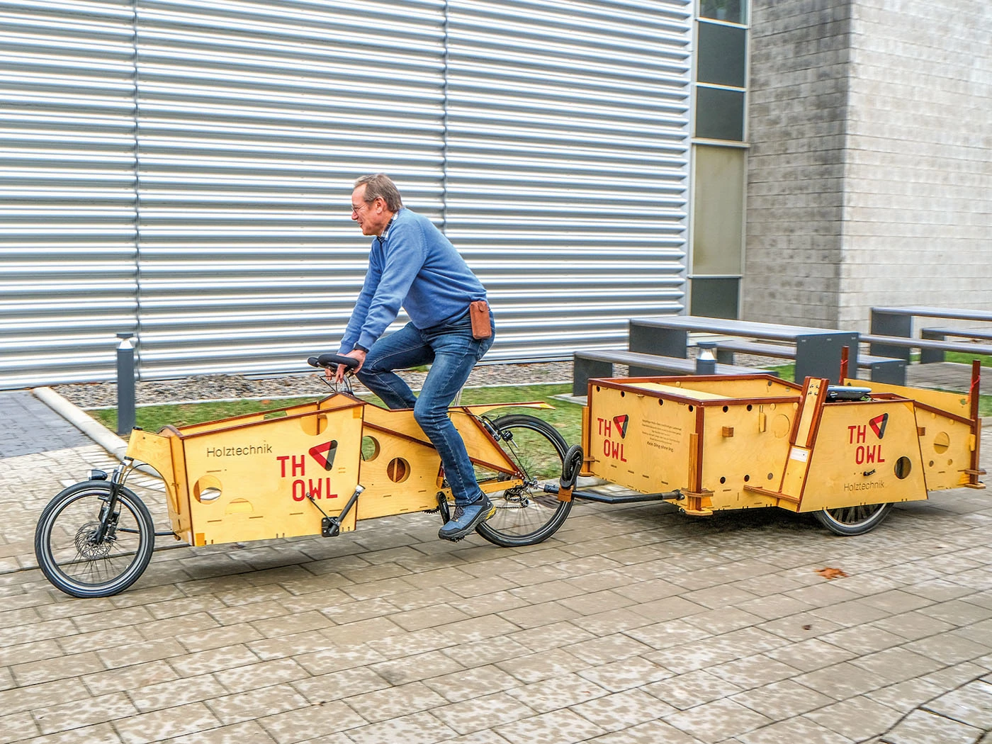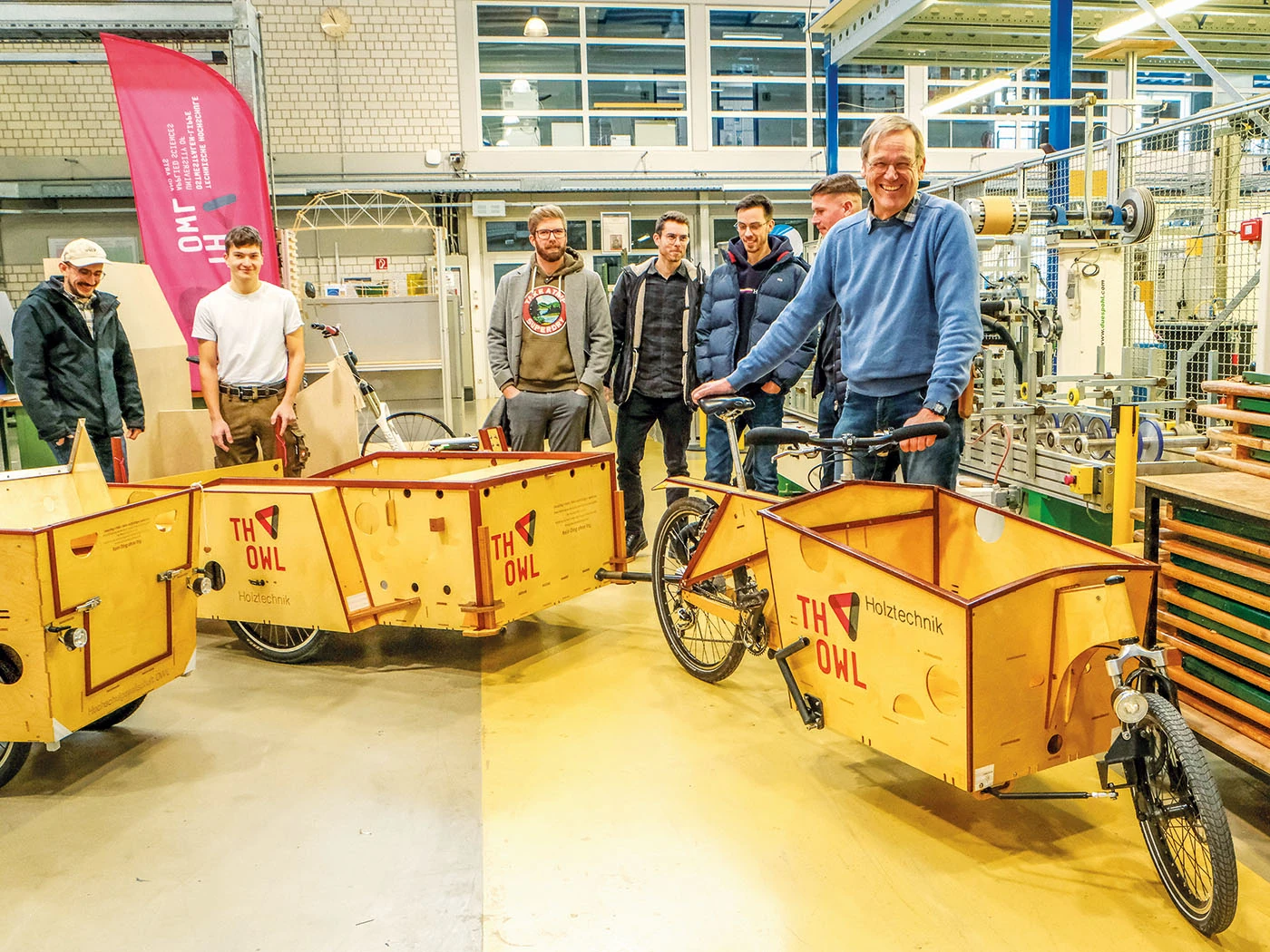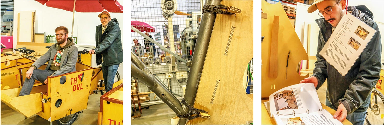 Als erstes fällt auf, dass der Uni-Campus für eine Kleinstadt wie Lemgo bemerkenswert groß und weitläufig ist, mit äußerst vielen schicken, neuen Gebäuden, und insgesamt sehr modernistisch wirkt. Viele Studiengänge werden angeboten, unter anderem der Studiengang Produktions- und Holztechnik. Kaum zu glauben, dass gerade im Fachbereich Holztechnik Fahrräder entworfen werden. Aber Professor Adrian Riegel ist immer auf der Suche nach neuen und fortschrittlichen Projekten für seine Studenten und Studentinnen. So kam er über Umwege auf die Idee, sich mit der Konstruktion und dem Bau von Lastenfahrrädern aus Holz zu beschäftigen. Nach einigen Experimenten wurde daraus eine größere Sache. Schnell war klar, dass hier die Form strikt der Funktion folgen soll. Dass mit den so hergestellten Rädern der im Möbelbau begehrte „Preis der guten Form“ nicht gewonnen werden kann, war schnell klar. Auch gibt es schon genug teure und schicke Räder, auch Lastenräder aus Holz, so Adrian Riegel.