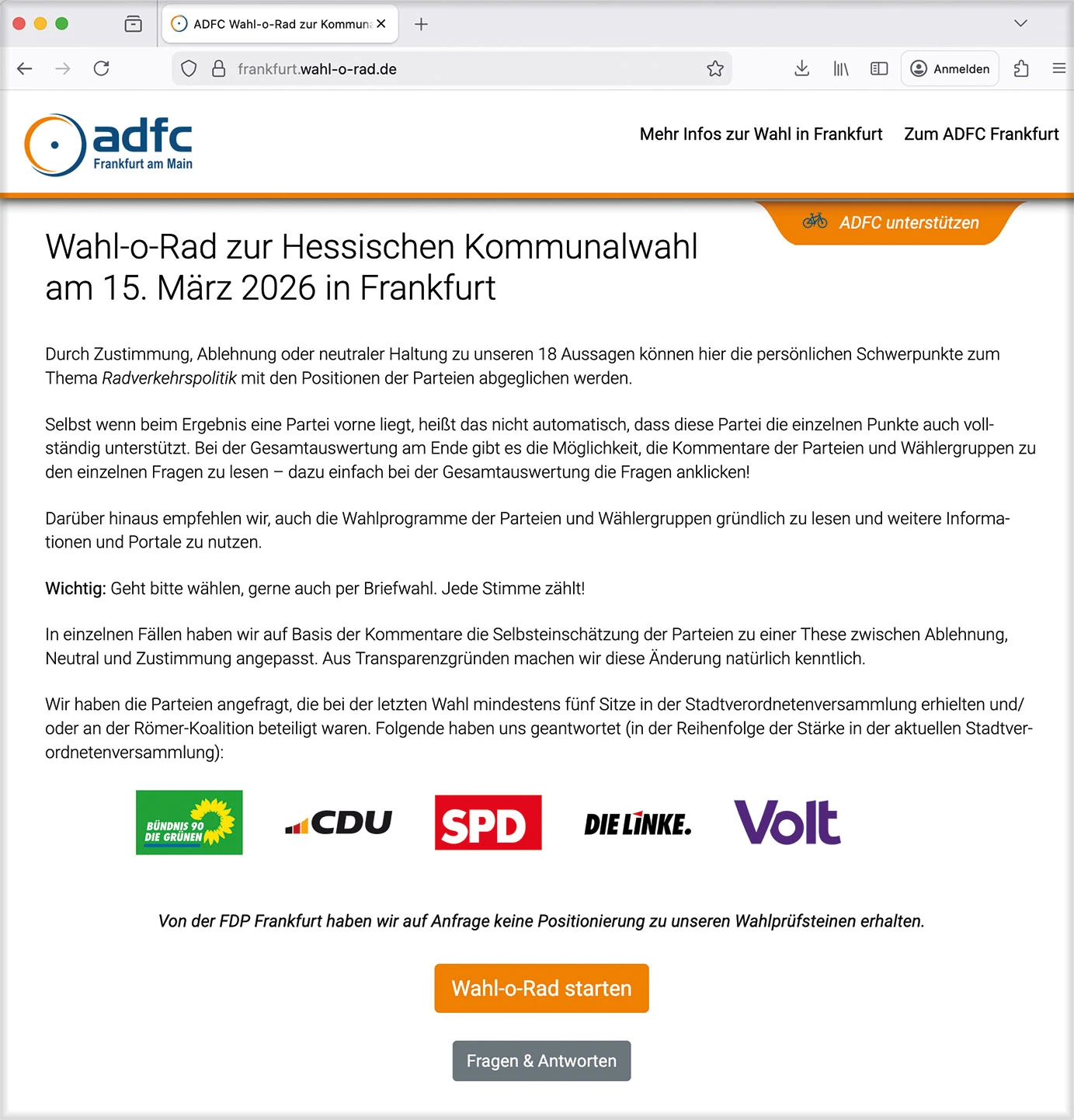 Der Wahl-o-Rad ist für Frankfurt unter frankfurt.wahl-o-rad.de erreichbar. Die Auswertung der Positionen erfolgt natürlich anonym und datenschutzkonform auf dem Computer oder Smartphone, der ADFC sieht das Abstimmungsverhalten gar nicht.