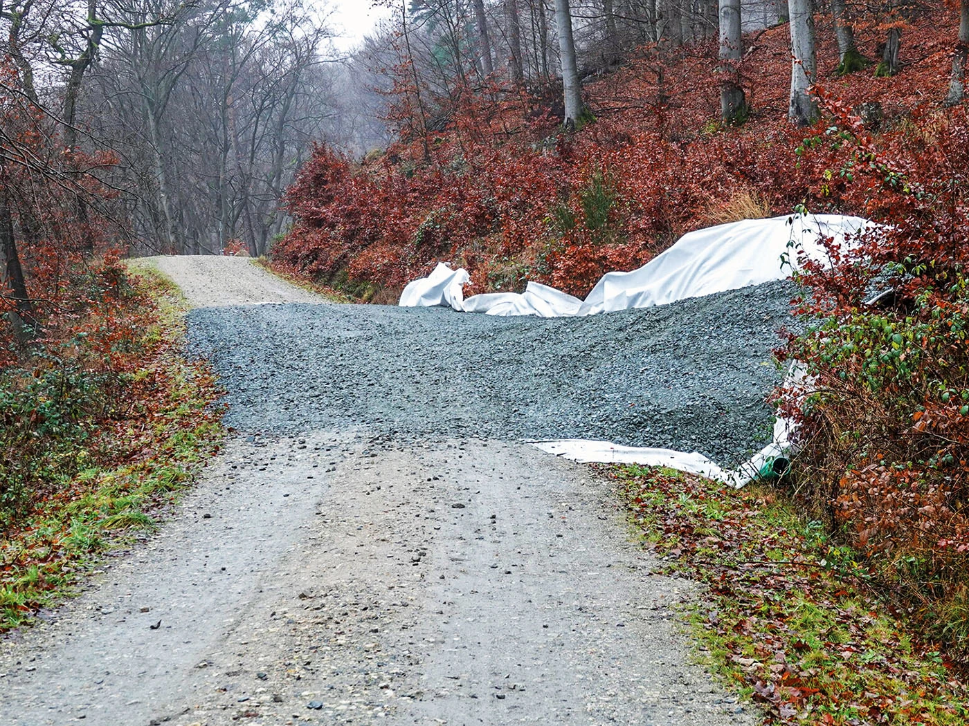 In diesem Zuge wurde jetzt möglicherweise auch eine Zufahrt an einer wichtigen Verbindung zwischen Hofheim und Lorsbach durch groben Schotter (Kantenlänge ca. 5 Zentimeter) schwer befahrbar gemacht (siehe Foto). An dieser Stelle steht nicht zu erwarten, dass hier Gräben quer zum Weg verlegt werden, hier ist voraussichtlich ein Tunnel geplant, für den vertikale Probebohrungen vorgenommen wurden und werden.
