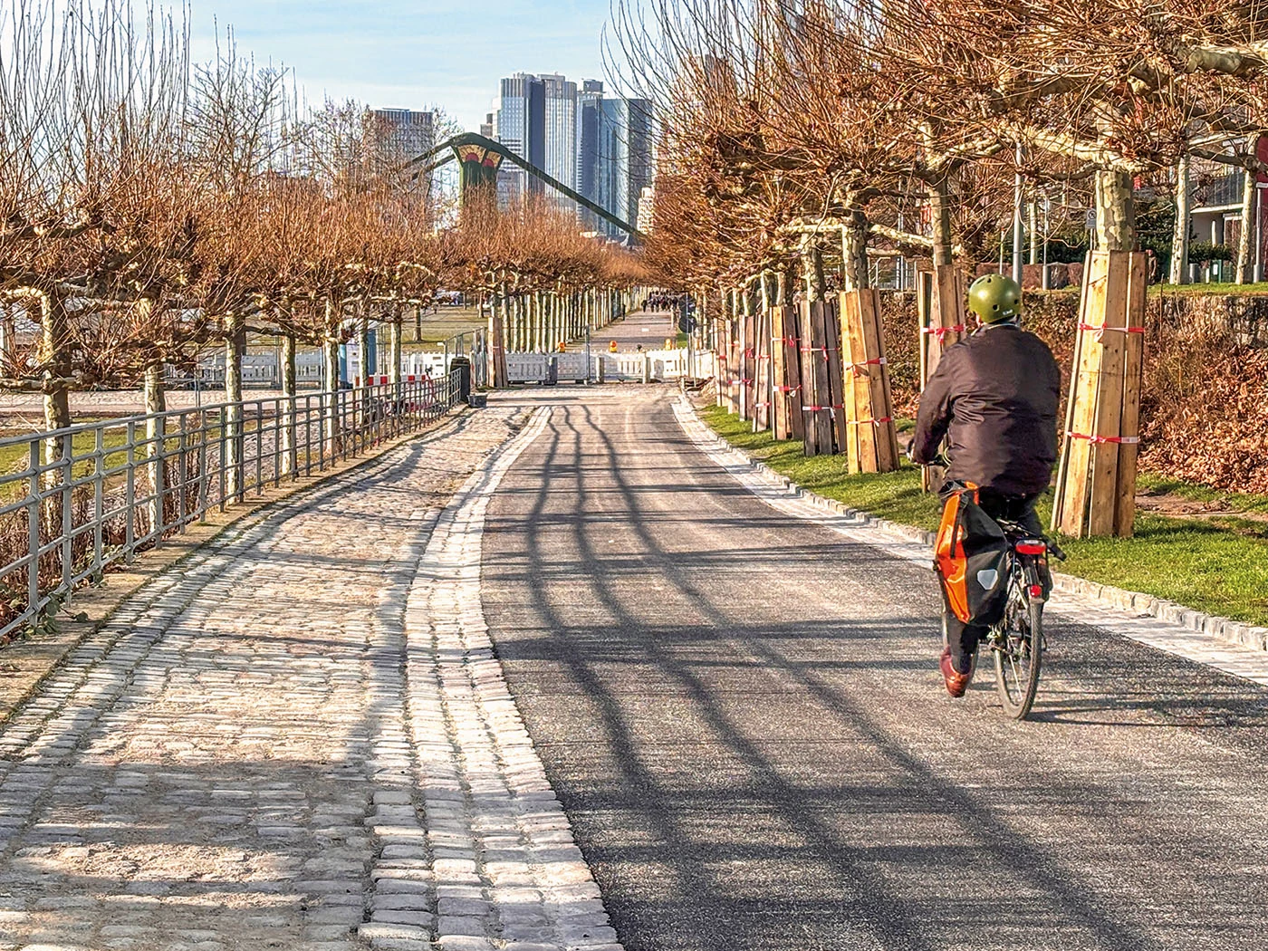 Dank eines Antrags des für Bornheim und Ostend zuständigen Ortsbeirates 4 aus dem Jahr 2020 rollten Ende 2025 endlich die Bagger: Der Weg und die Rampe vom Mainuferweg hoch zum Restaurant „Oosten“ werden gerade umgebaut, das Kopfsteinpflaster verschwindet auf einer Breite von ca. drei Metern. Davon profitiert aber nicht nur der Radverkehr, sondern auch Menschen mit Kinderwagen, Rollatoren oder Rollstühlen. Dementsprechend wird die Maßnahme über das Förderprogramm „Maßnahmen für die Herstellung von Barrierefreiheit“ gefördert. Die Bauarbeiten waren vor Weihnachten nahezu abgeschlossen, die Wege aber noch gesperrt (der Radfahrer auf unserem Foto drehte kurz darauf vor der Absperrung um und kam zurück).