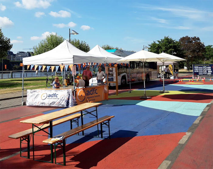 Es war eine größere Sache als letztes Jahr, denn diesmal spielte auch das Wetter mit: zweitausend Radler*innen fanden sich zur diesjährigen Frankfurter ADFC bike-night zusammen. Am Sammelpunkt Mainkai gab es zunächst eine verkehrspolitische Kundgebung, schließlich ist die bike-night nicht nur Event, sondern auch Demonstration.