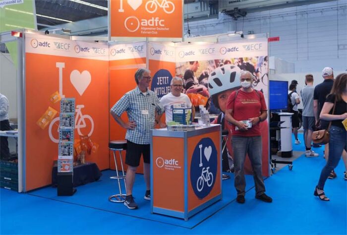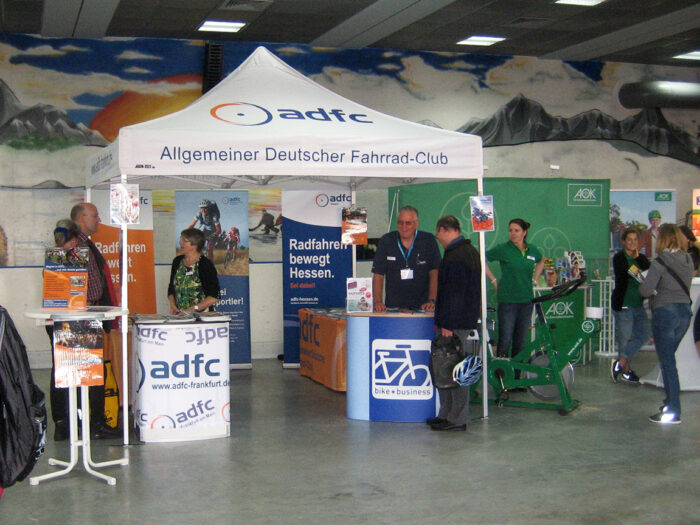 Der ADFC war wie üblich vertreten, im Politik-Bereich in Halle 8, mit einem Stand des Bundesverbandes. Aktive aus Frankfurt und Hessen unterstützten ihn dabei.