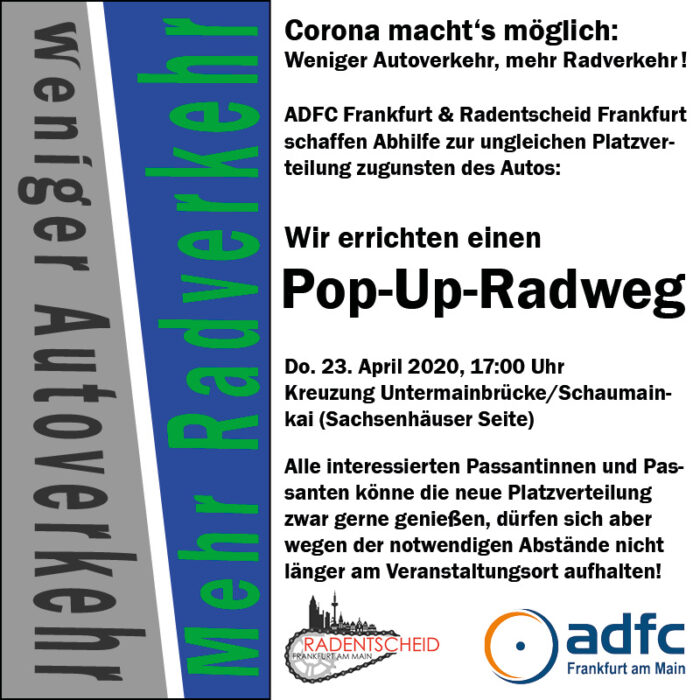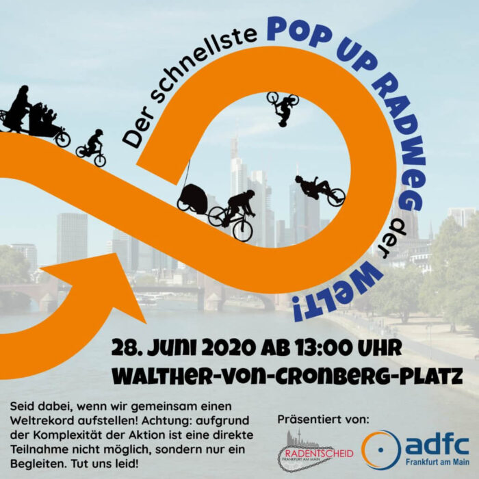 Um diesen Richtungswechsel mit Nachdruck einzufordern, haben sich ADFC Frankfurt, Radentscheid Frankfurt, VCD Regionalgruppe Rhein-Main, Extinction Rebellion und Transition Town Frankfurt mit Greenpeace Frankfurt zusammengetan, um am 23.05.2020 den von Greenpeace Deutschland ausgerufenen Popup Bikelane-Aktionstag mit Leben zu füllen...