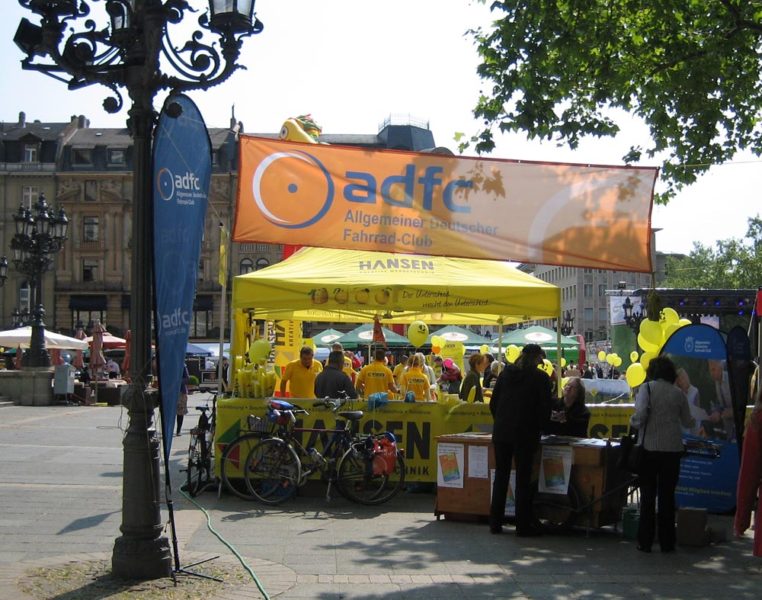 Früher hieß das populäre Radrennen am 1. Mai "Rund um den Henninger-Turm". Dann ließen die trinkfaulen Hessen die Marke Henninger ("und abends geht wieder die Sonne auf") absaufen, und deshalb muss das Rennen heutzutage, wegen der Sponsoren, den seltsamen Titel "Rund um den Finanzplatz Eschborn-Frankfurt" tragen. Um die Radsportfans darüber hinwegzutrösten, beteiligte sich der ADFC, genauer gesagt seine Kreisverbände Frankfurt und Main-Taunus-Kreis, diesmal am Publikums-Begleitprogramm.