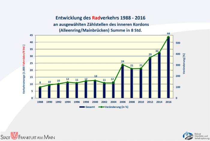 Bravo für Frankfurts Radfahrer und Radfahrerinnen: Verdoppelung des Radverkehrs von 2010 bis 2016 in den zentralen Stadtteilen! Die „Stadtrandzählung“ des Amts für Mobilitätsplanung zählt alle 2 Jahre den KFZ-Verkehr an einem „äußeren Kordon“ in etwa entlang der Stadtgrenzen...