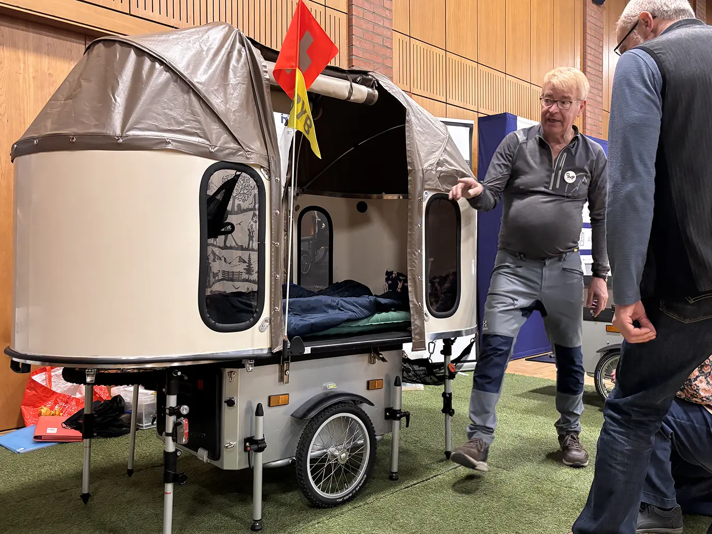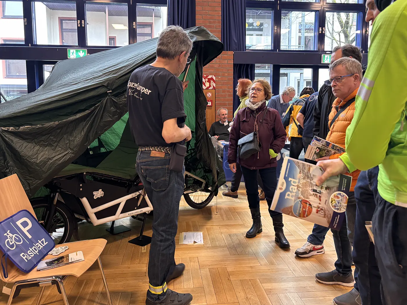 Ralf Lemster, langjähriger ADFC-Aktiver, hätte nicht gedacht, dass er im Alter von 60 Jahren noch zum Camper werden könne. Doch das von ihm vorgestellte „SpaceCamper-bike“ mit Liegesitz und Zeltaufbau hat ihn begeistert und damit überzeugt, das Hotelbett gegen die Campingwiese zu tauschen. Seine Begeisterung konnte er auf viele der Besucher:innen übertragen – Ralf war pausenlos im Gespräch über sein Outdoor-Modell. Ähnlich erging es dem Gründer von „CampCycle“, der extra für die Messe aus der Schweiz angereist war. Er zeigte, wie er seinen kleinen Fahrrad-Anhänger schnell in eine komfortable Behausung für die Nacht umbauen kann. Auch hier staundendes Publikum, das sich für die Feinheiten der Konstruktion interessierte.
