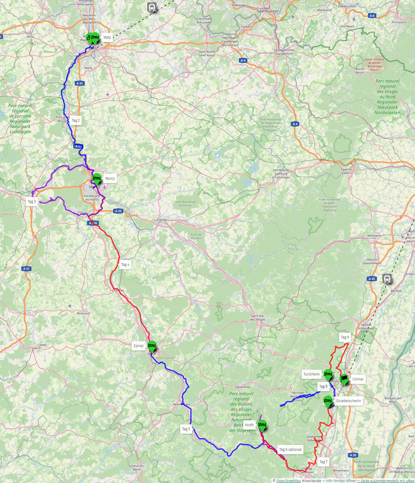 Mit der Bahn fahren wir nach Metz. Die dortige Altstadt bezaubert uns mit historischen Bauwerken, zahlreichen gotischen Kirchen und barocken Platzanlagen. Fast immer an der Mosel entlang gelangen wir nach Nancy. Neben dem zentralen Place Stanislas sowie weiteren Plätzen, die mit Ihrem architektonischen Ensembel seit 1983 zum UNESCO Weltkulturerbe zählen, wird die Stadt auch durch das einstige Zentrum des französischen Jugendstils geprägt. Später erreichen wir Epinal, was die Hauptstadt des franz. Departements Vosges ist. Auf ehemaligen Bahntrassen und einem kleinen Pass vorbei an der Moselquelle mit anschießender rasanten Abfahrt kommen wir in die Nähe des Lac de Kruth-Willdenstein. Weiter geht es im Tal der Thur über Thann (mit der Eglise St. Thiébaut, große gotische Kirche) und Cernay zur südelsässischen Weinstraße. Vorbei an Weinorten wie Guebwiller nach Gueberschwihr und weiter über Eguisheim, Turckheim, Kayersberg, Requewihr, Ribeauville und Bergheim nach Colmar. Zwischendrin auch einen Abstecher ins Munstertal. Bahnrückfahrt von Colmar nach Frankfurt.