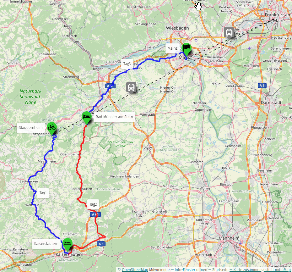 Nach einer Bahnanfahrt bis Staudernheim an der Nahe, radeln wir an der Glan und Lauter entlang bis Kaiserslautern (1 ÜF).