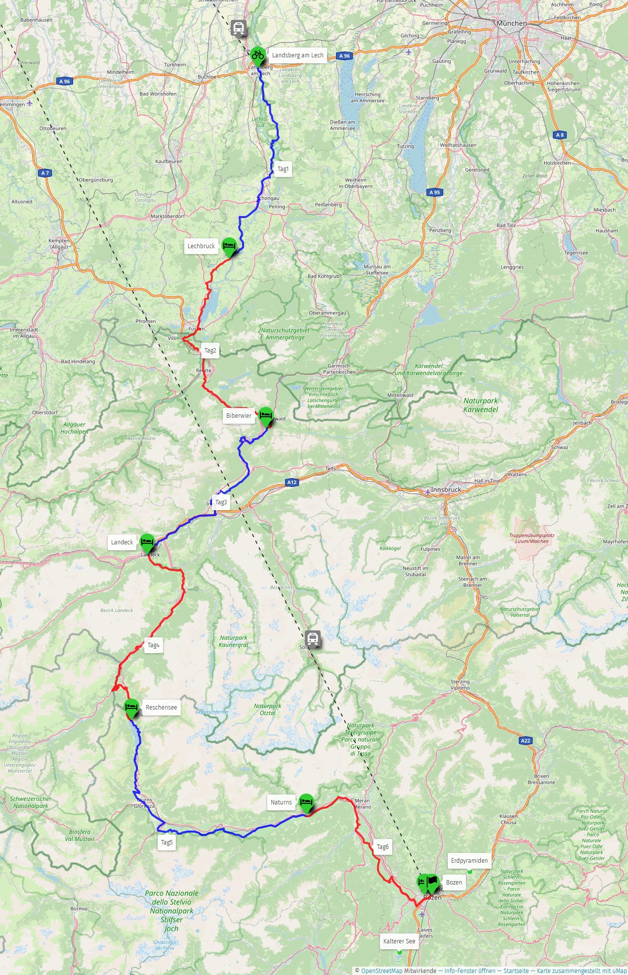 Wir starten in Landsberg/Lech und fahren mit stetigem Blick auf die Alpen durch die grüne, wellige Allgäuer Voralpenlandschaft. Bei Füssen tauchen wir ein in die deutschen Alpen, jedoch statten wir vorher noch den Königsschlössern einen kleinen Besuch ab. Über das Lechtal geht es in das Zugspitzgebiet. Der Fern-Pass lockt, den wir gemeinsam meistern werden um danach in kurzer Zeit Richtung Imst / Landeck einzuschwenken. Das Inntal begleitet uns bis Martina (CH). Der Reschen-Pass mit dem Lago di Resia, der Vinschgau und das Etschtal (radeln durch die Kulturlandschaften „Almwiesen – Obstplantagen – Weinberge“) bis Bozen sind die Highlights.
